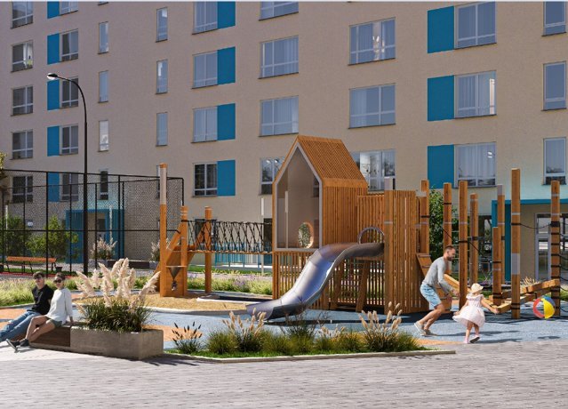 Дети весело играют на площадке, а родители не беспокоятся об их безопасности, ведь парковочные места для автомобилей вынесены за пределы дворов